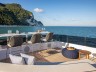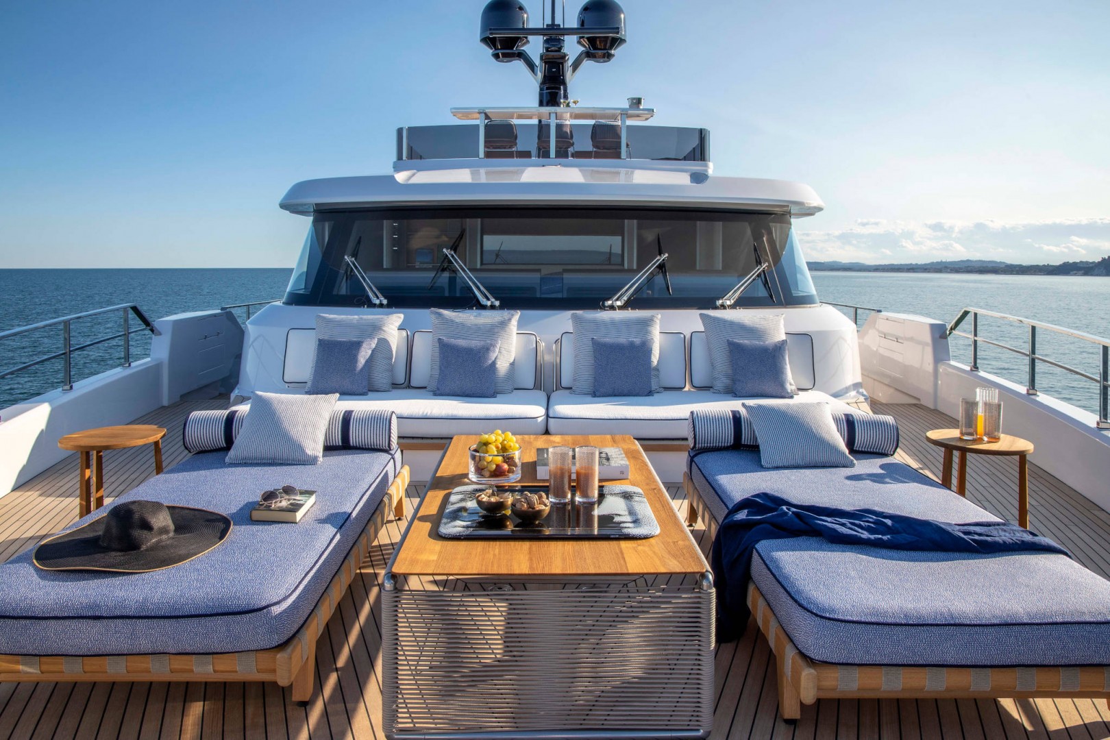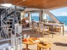 Kljub dovršenosti interierja lahko rečemo, da je prava zvezda superjahte zunanja zgornja paluba, kjer se na 37 kvadratnih metrih razprostirata lounge in jedilnica, ki omogočata obedovanje al fresco za trenutke, ki se vtisnejo za vedno v spomin. Zavite stopnice, pri katerih se prepletajo karbon, jeklo, tik in vrvi, vodijo do najvišjega krova, kjer poleg s soncem obsijane barske mize s stoli najdemo velikodušno zofo. V enakem slogu je zasnovan tudi premec z dvema ležalnikoma, ki je prava oaza miru in zasebnosti.