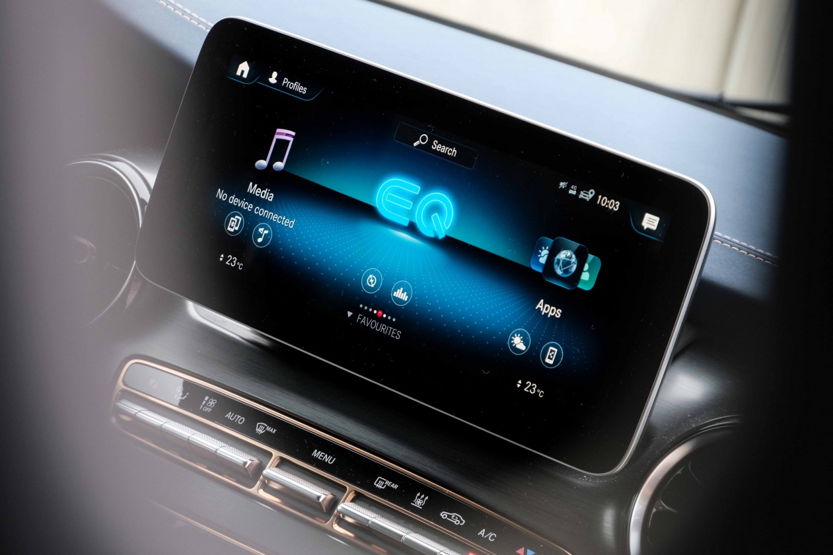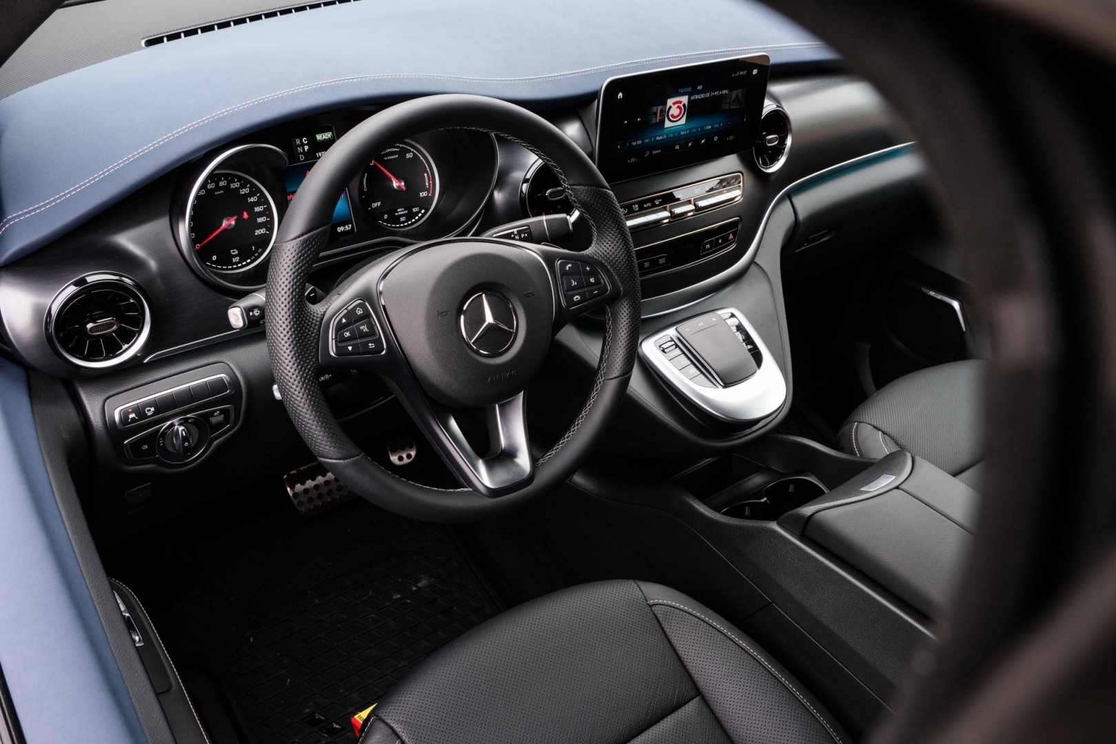 Večjih sprememb v potniški kabini električnega V-ja ni, z izjemo novih barv oblazinjenja, ki je bila v našem primeru modra; ta je krasila celotni zgornji del armaturke in vratne obloge v vseh treh vrstah. EQV je na voljo z osmimi sedeži, bolj delovno usmerjeni električni brat eVito Tourer pa lahko nudi prevoz devetim potnikom. Drugačno funkcijo imajo tudi obvolanske ročice, preko katerih voznik nastavlja stopnjo rekuperacije. Klasični obratomer je nadomestil merilnik, ki prikazuje delovanje elektromotorja in njegove moči.