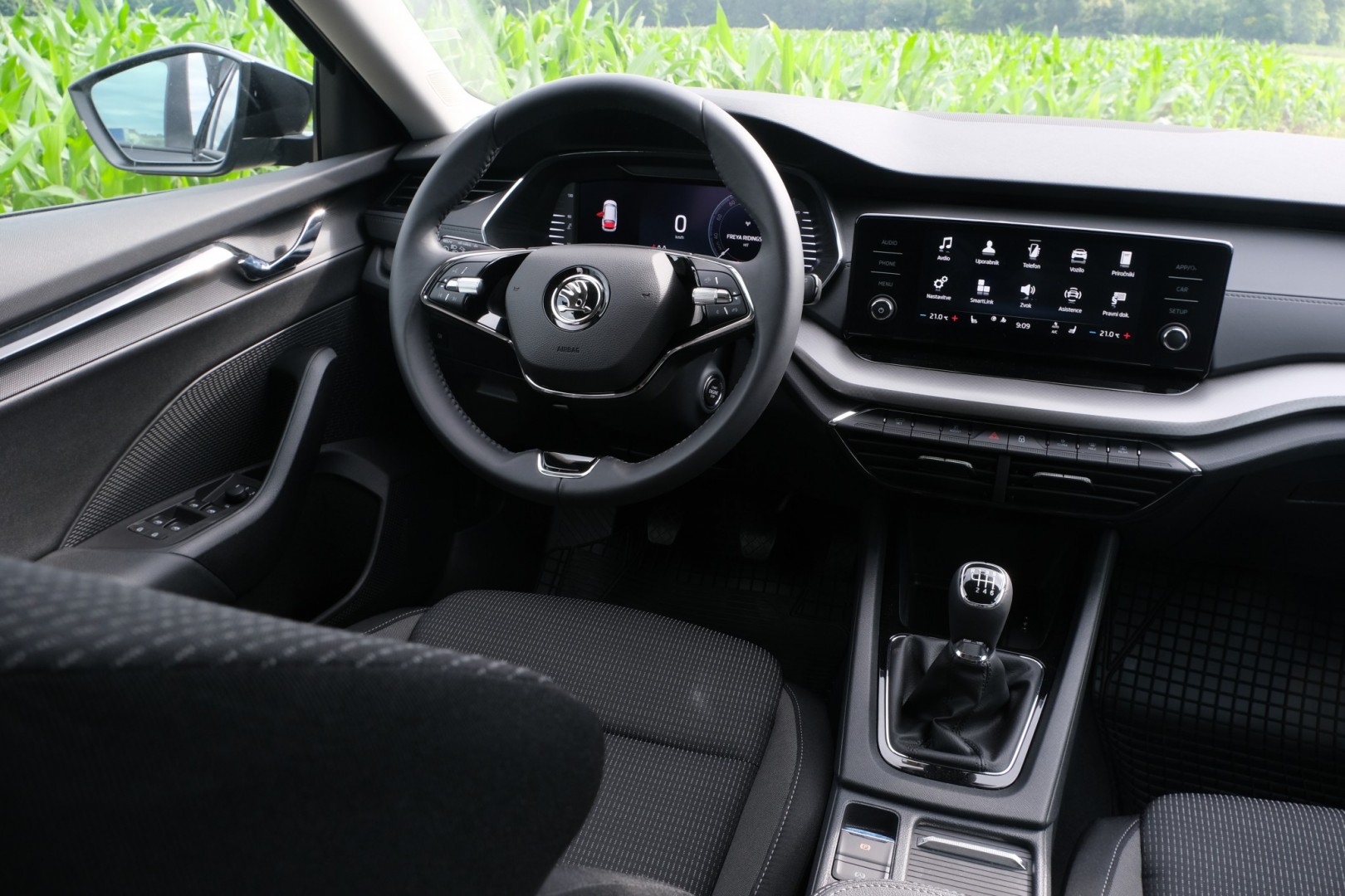Prava mala revolucija se je zgodila v kabini, kjer so celotno delovno okolje digitalizirali, pri čemer so vse glavne funkcije združene v osrednjem zaslonu, bližnjice do njih pa so nameščene pod ekranom na fizičnih stikalih. Serijsko meri ekran 8,25 palca in ima ob straneh fizične gumbe, medtem ko je opcijski 10-palčni zaslon popolnoma digitaliziran. Klasičnih analognih merilnikov ni več v ponudbi, že v serijskem paketu so namreč ti digitalizirani. Povsem nov dizajn je dobil volanski obroč, ki je dvokrak in se ponaša z ergonomskimi stikali za upravljanje. Na novo je oblikovana tudi celotna armatura v dveh nivojih, ki je odeta v mehkejše, na otip prijetnejše materiale. Prav tako so novi sedeži; na voljo so tudi ergonomski z masažno funkcijo, ki so debi doživeli ravno v Octavii. Prvič sta v Škodinem modelu projicirni zaslon in triconska klimatska naprava.