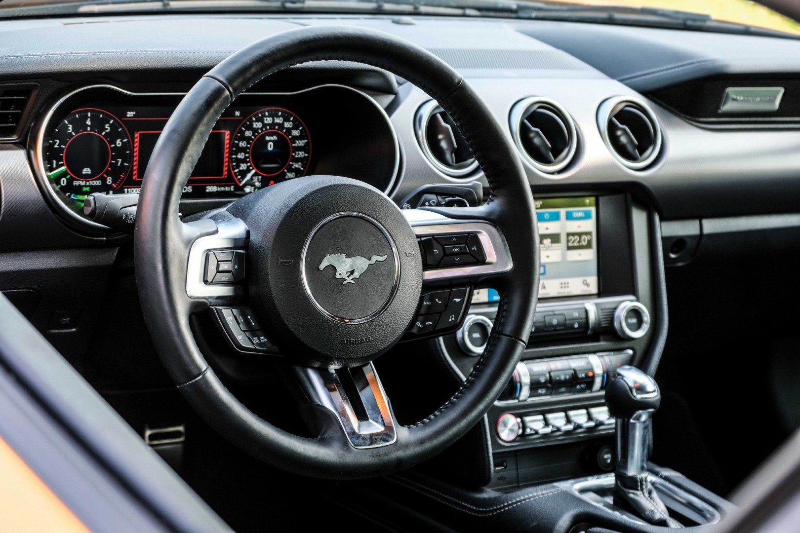 Notranjost? Delovno okolje v Mustangu ostaja tipično ameriško. Veliki zračniki, velik volan, veliko fizičnih stikal, velikih gumbov in velika usnjena fotelja. Posodobili so tudi merilnike, ti so po novem digitalni. Mustang seveda ostaja žejen sopotnik, včasih zna z lahkoto popiti tudi preko 20 litrov na sto. Legenda preko sebe pač ne more, niti ne želi.